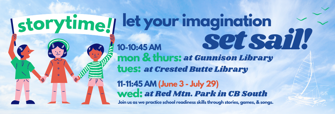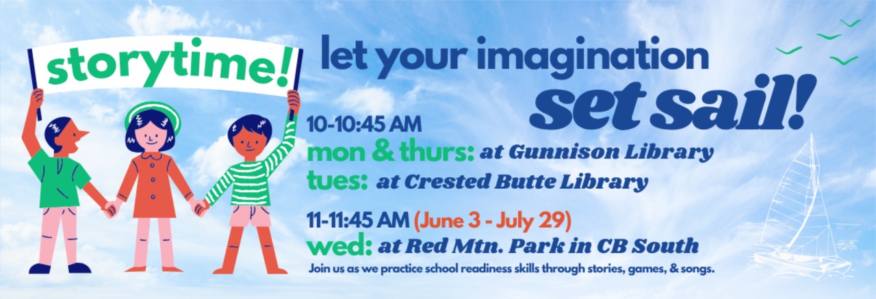 Join us for Storytime on Tuesdays from 10-10:45 am at the Crested Butte Library as we practice school readiness skills through stories, games, and songs.